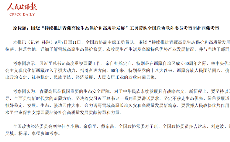 9月7日至11日,全國政協(xié)副主席王勇帶隊,圍繞“持續(xù)推進(jìn)青藏高原生態(tài)保護(hù)和高質(zhì)量發(fā)展”...